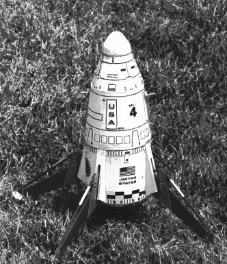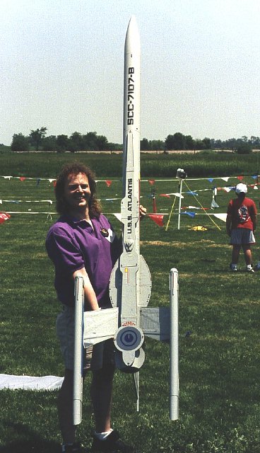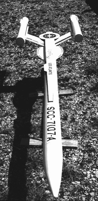 I am most proud of the latest model in this series, the USS Atlantis B, here shown before it's maiden flight on an Aerotech J Hybrid at MRFF 96. Built a bit stronger than the original, this model weighs in at 16.5 pounds at launch. The model contains an ALTS-2 altimeter and an ECS 2-B radio system for ejecting the drogue and main parachutes. |